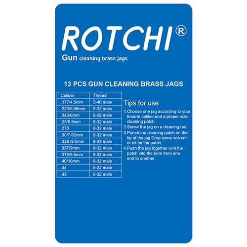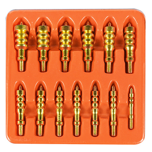Опаковка от 13 броя месингови накрайници за почистване на пистолети комплект, блистерна опаковка, размери: .177, .22, 6 мм, .25, .27, .30, .338, .35, .357, .40, .44, .45, .50 кал.