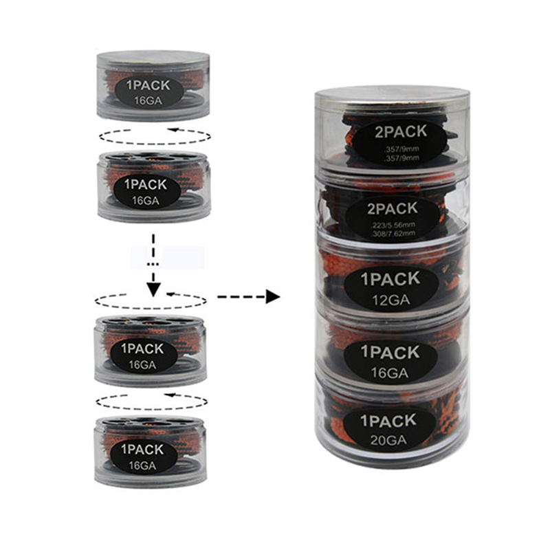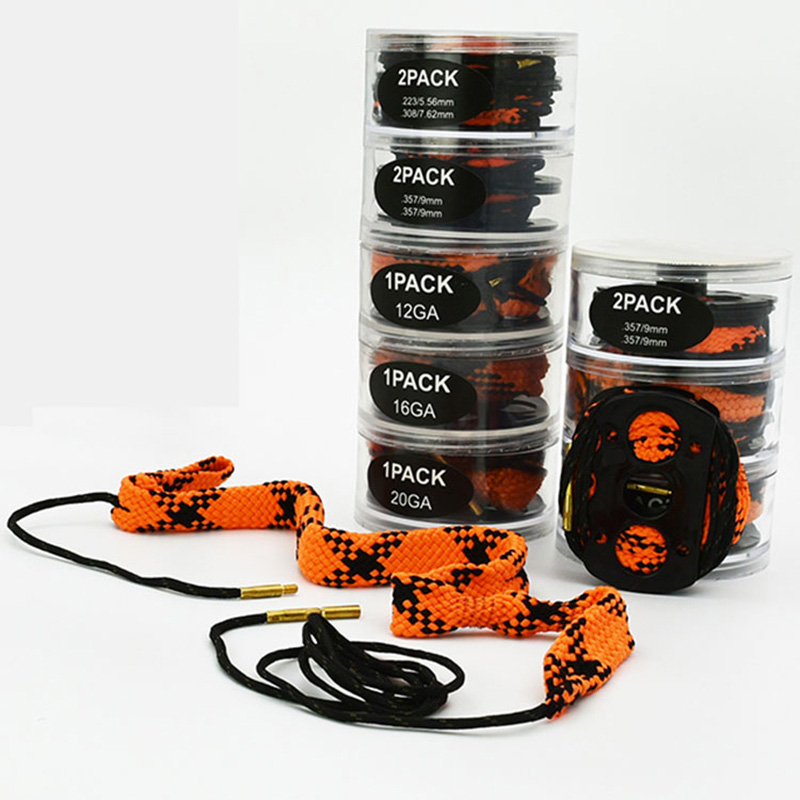 ● Въжетата за почистване на пистолети са зашити здраво, няма да се счупят лесно; Въже от синтетични влакна с вградена четка може да почисти отвора бързо и ефективно. Номерът на калибъра е лазерно отпечатан върху всяка крайна гайка. Въжетата могат да се перат за повторна употреба.