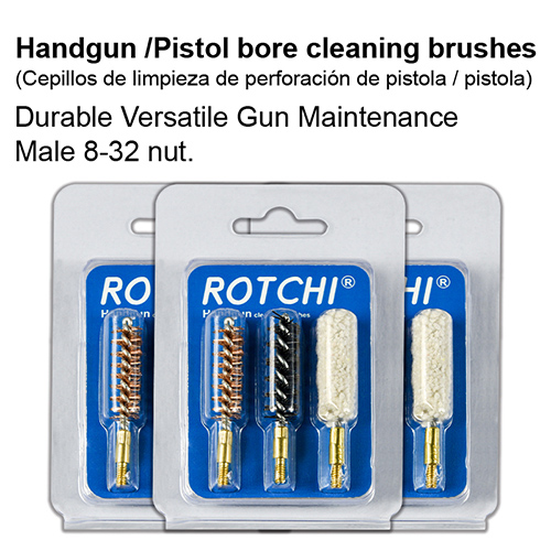 Комплект четка за почистване на дулата на пистолета 3 в 1, блистер и карта пакет. Налични размери: .22, 9mm, .40, .45cal.