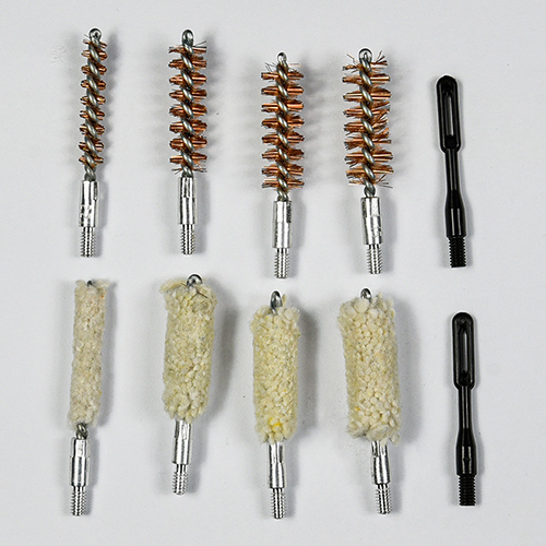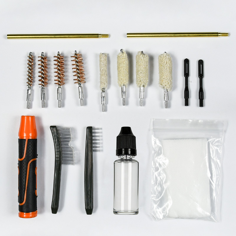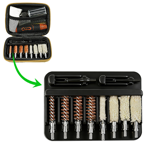 Комплектът за почистване на пистолет включва 4 размера (.22, 9 mm, .40, .45 cal.). Покрити с плат OX PVC калъф с цип. Месингови четки и памучни мопове, 2 пръта. Пясъци и черно цвят за избор.