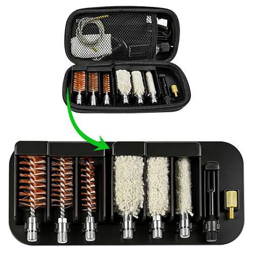Комплектът за почистване на пушка включва 3 размера (12/16G, 20G, 410). Месингови четки и памучни мопове, 4 пръчки 1 калб. Пясък и черен цвят за избор.