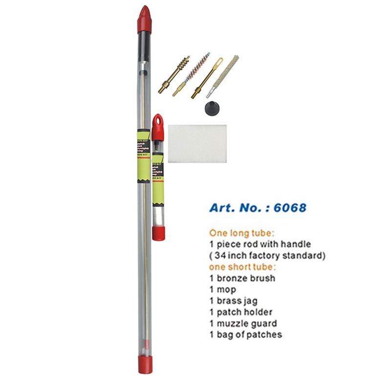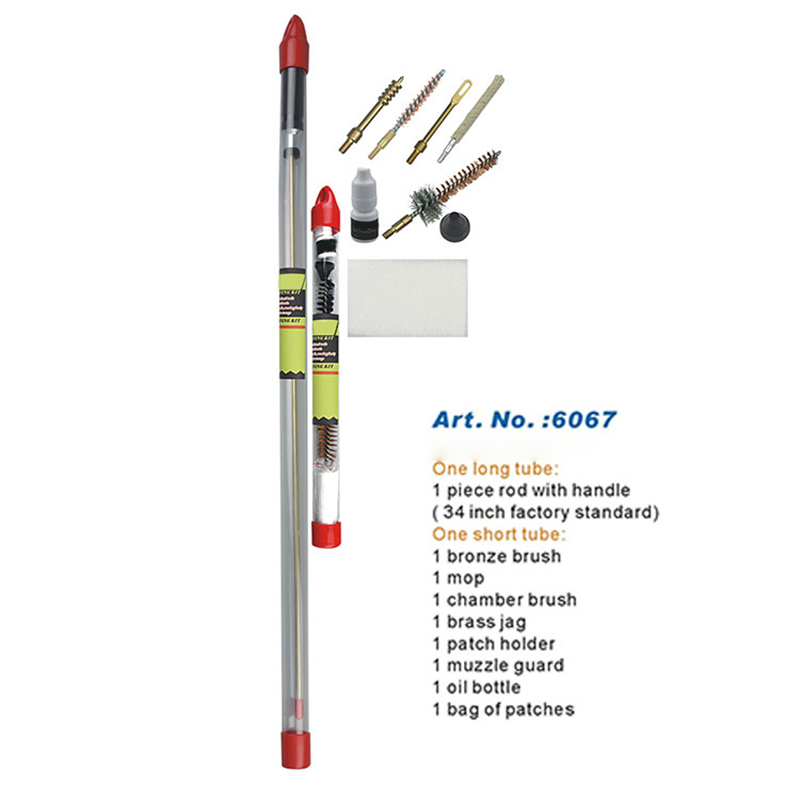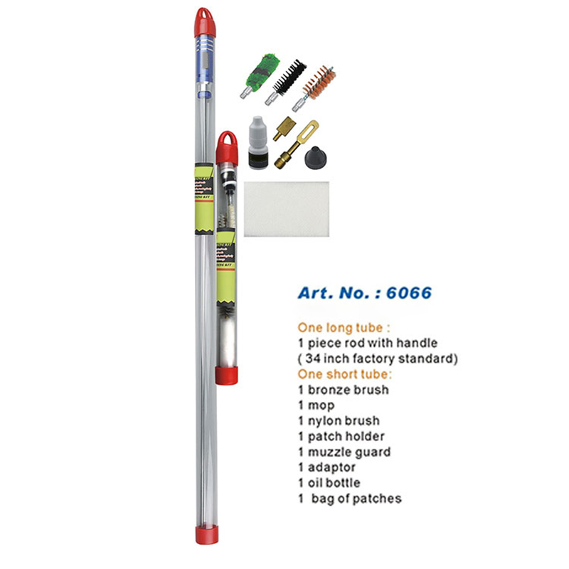 Комплект за почистване на пушка Едно парче Опаковка с дълъг прът за окачване ● Дълъг прът от една част 34 инча/860 мм, без рязане, без стъпване върху пръта. ● Мощни четки и аксесоари, подходящи за почистване на отвора. ● Въртящата се алуминиева дръжка се движи свободно ● Опакована в дълга прозрачна тръба, за лесно вземане и съхранение. ● Лесно поставяне на OEM или клиентски стик и лого