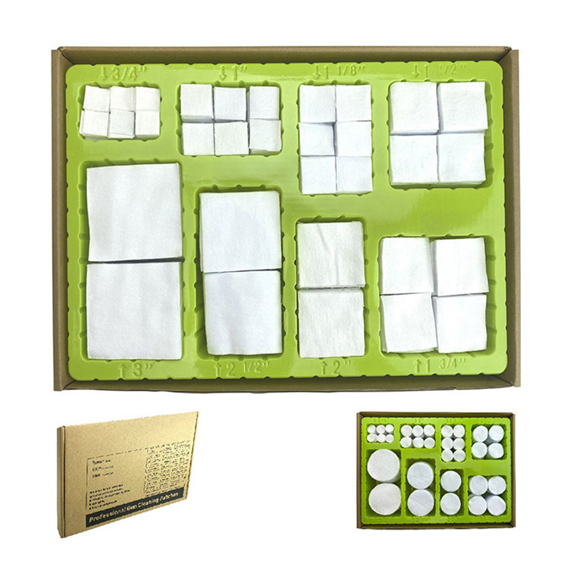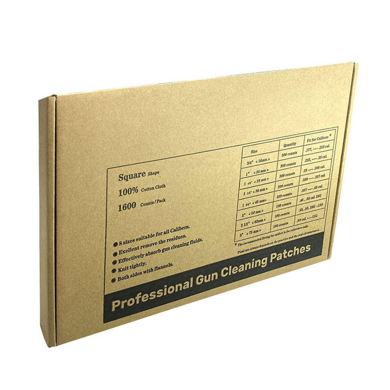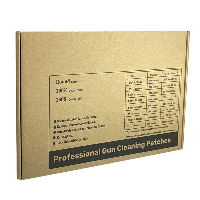 Универсална бяла памучна кърпа Квадратни лепенки за почистване на пистолети Блистерна кутия 8 размера, 1600 броя ● 【Всичко в един комбиниран пакет】8 размера почистващи лепенки могат да се поберат за всички калибър огнестрелни оръжия от .177cal. към пушка 12G; Спестете парите и времето си, за да купувате различни размери за вашите огнестрелни оръжия с различен калибър; ● 【Памучен материал с висока абсорбция】100% памучен материал с висока абсорбция. Бързо абсорбира останалите течности, премахва остатъците и ръждата от повърхността на отвора. ● 【Фланелена кърпа】Повърхността на фланелената кърпа значително подобрява чистотата. ● 【Всеки размер в тава】 Опаковаме 8-те размера по 8 тава. И всяка тава със своя размер, отпечатан до тавата. Лесен за намиране и вземане на правилния размер от опаковката. ● 【OEM】Логото на клиента е приемливо.